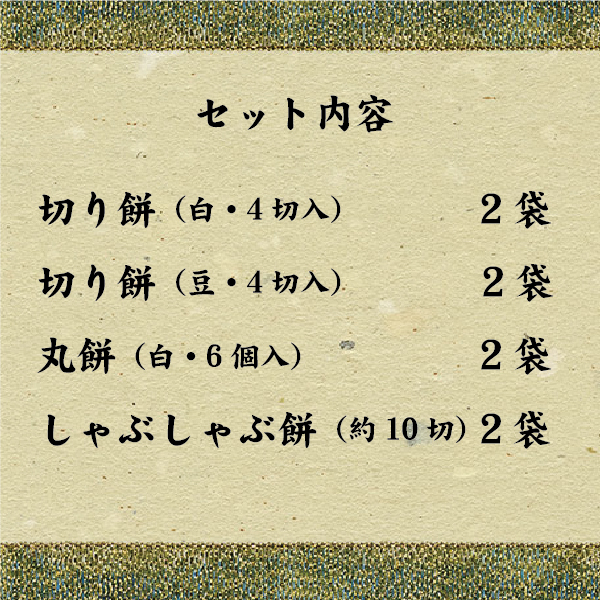 切り餅、丸餅、しゃぶしゃぶ餅の詰め合わせ。焼いてそのまま食べてもよし。お鍋に、お雑煮に、おしるこにご利用下さい。